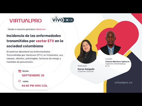 Este webinar trata sobre las Enfermedades Transmitidas por Vectores (ETV) en Colombia, sus causas, efectos, patologías, factores de riesgo y medidas de prevención.